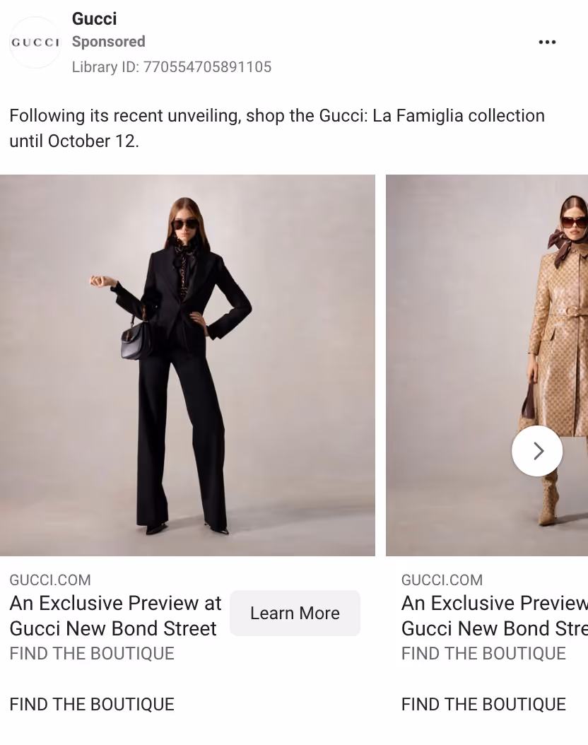 GUCCI run many ads that are focussed on driving footfall to local stores. This simple carousel Facebook ad is just one example of how they do this so effetively, using short videos and newness to entice.
